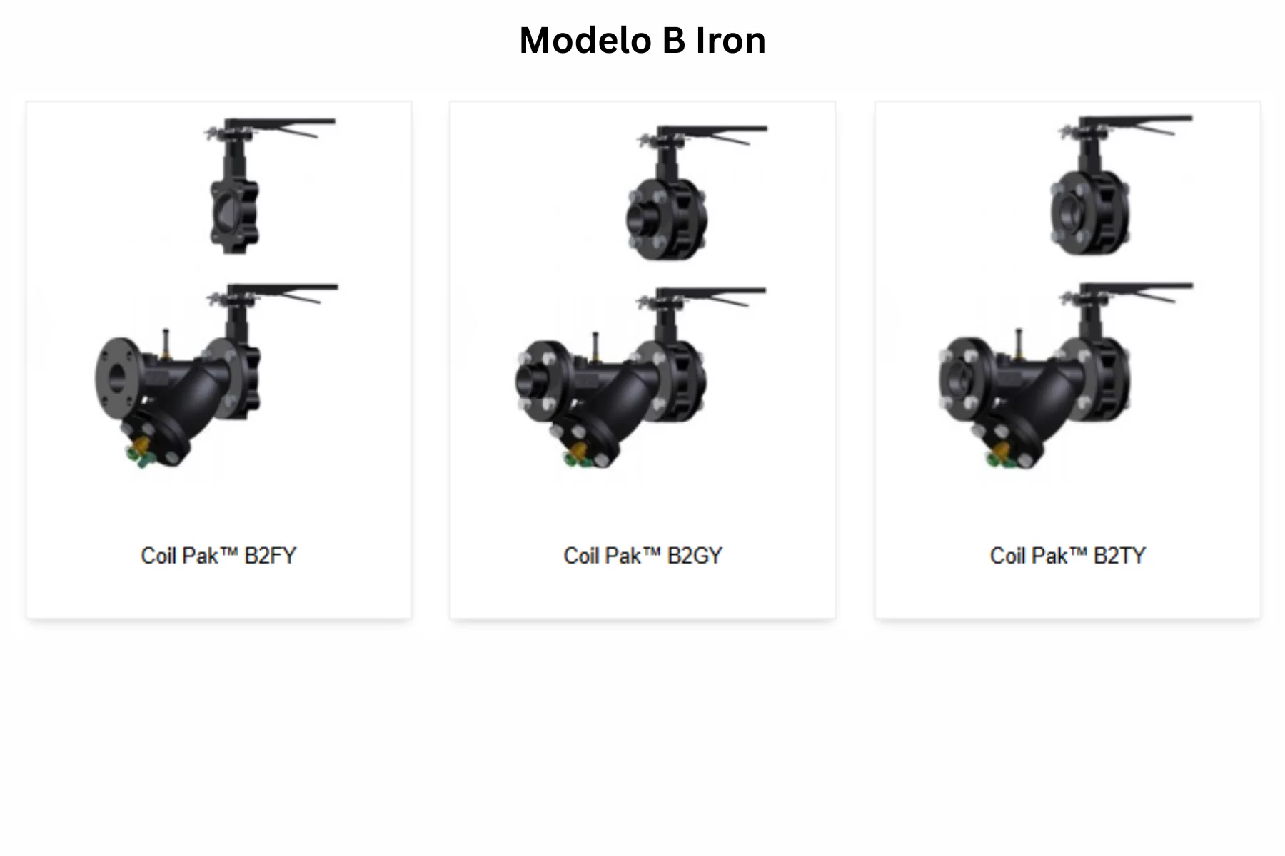 La familia Modelo B Iron incluye B2FY, B2GY y B2TY. Esta serie está orientada a configuraciones de hierro con butterfly valve y 125# flanged Y-strainer, integrando removable filter screen y blowdown/drain valve dentro del mismo arreglo. La especificación publicada para la serie marca 175 PSIG y 250°F, con construcción en cast iron ASTM A126. Es una familia útil cuando el proyecto necesita un paquete compacto de aislamiento y filtrado dentro del mismo ensamble.