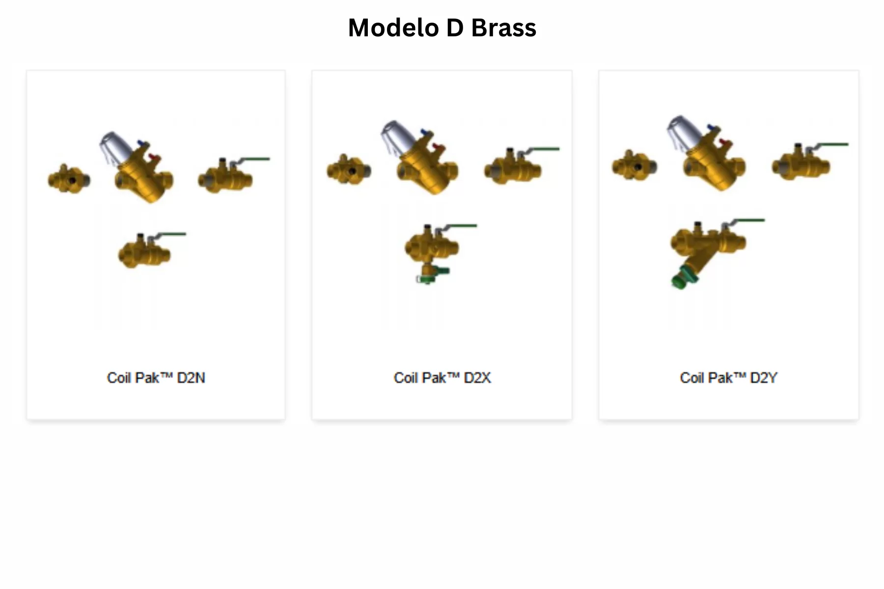 La familia Modelo D Brass integra Coil Paks con PICV flow control y reúne los modelos D2N, D2X y D2Y. En esta serie, el retorno combina UltraNXP™ NXP, Dynamic™ PICV con dos puertos de prueba y UltraU™ UU union con manual air vent; el lado de suministro cambia según la configuración. En D2N se equipa con UltraNXP™ NXP, mientras que en D2Y se integra UltraY™ UY combination strainer, ball valve and union end con blowdown/drain. La serie trabaja con cuerpos a 600 WOG y 325°F y cuerpo PICV a 360 PSIG y 250°F; integra external max flow adjuster, removable flow cartridge, differential pressure regulator, integrated measuring venturi y temperature control valve, con precisión de ±7% y precisión de Venturi de ±3%. En las configuraciones publicadas, la familia cubre desde ½” y llega hasta 2½” según el arreglo.