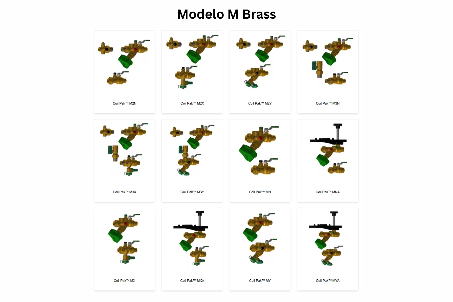 La familia Modelo M Brass reúne los modelos M2N, M2X, M2Y, M3N, M3X, M3Y, MN, MNA, MX, MXA, MY y MYA. Son Coil Paks con multi-turn manual flow control valve, pensados para proyectos que requieren ajuste manual de caudal y lectura más precisa en arreglos compactos de latón. La serie trabaja a 600 WOG y 325°F, con extremos disponibles en FNPT, SWT, NexPress™ y NexLok™, extremos unión intercambiables, O-rings, flechas anti-expulsión, doble sello, multi-turn position indicator, manual air vent y precisión de ±5%. Para la configuración M2N, el rango publicado va de 0.25 GPM a 40.00 GPM en tamaños de ½” a 1½”.