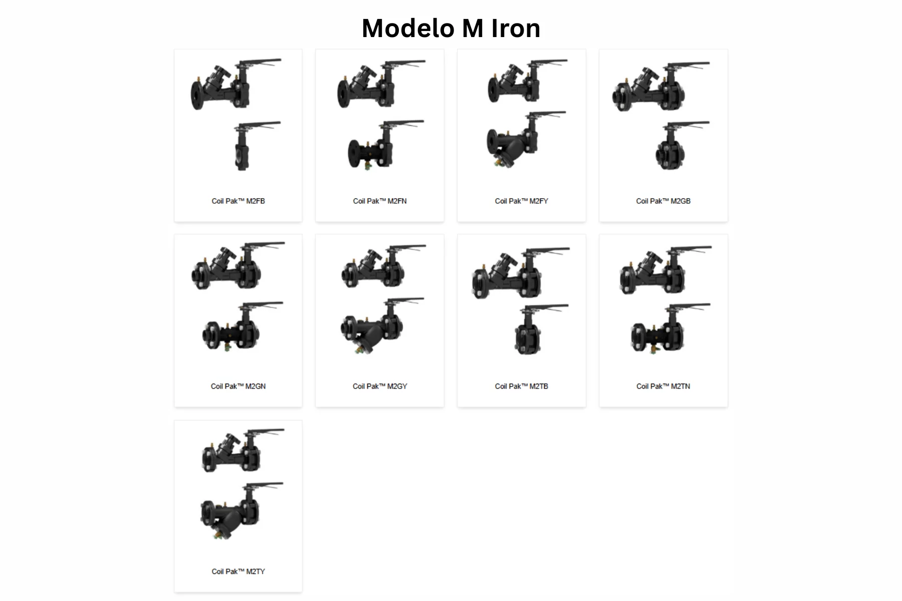La familia Modelo M Iron reúne M2FB, M2FN, M2FY, M2GB, M2GN, M2GY, M2TB, M2TN y M2TY. En esta serie, el lado de retorno incorpora una válvula UltraMB™ de balanceo multi-turn y el lado de suministro cambia entre aislamiento, instrumentación o filtrado según la versión. En M2FB, el retorno integra UltraMB™ MBFV y el suministro utiliza BV butterfly isolation valve; en M2GB, el suministro utiliza BVG butterfly isolation valve; y en M2FY, el suministro integra Strainex™ SXFV. La ficha de M2FB publica 232 PSIG y 250°F, conexión bridada, precisión de ±5%, tamaños de 2½” a 12” y un rango de 1.10 GPM a 3,200.00 GPM. La ficha de M2GN conserva 232 PSIG y 250°F, precisión ±5% y el mismo espectro general de caudal en configuración ranurada.