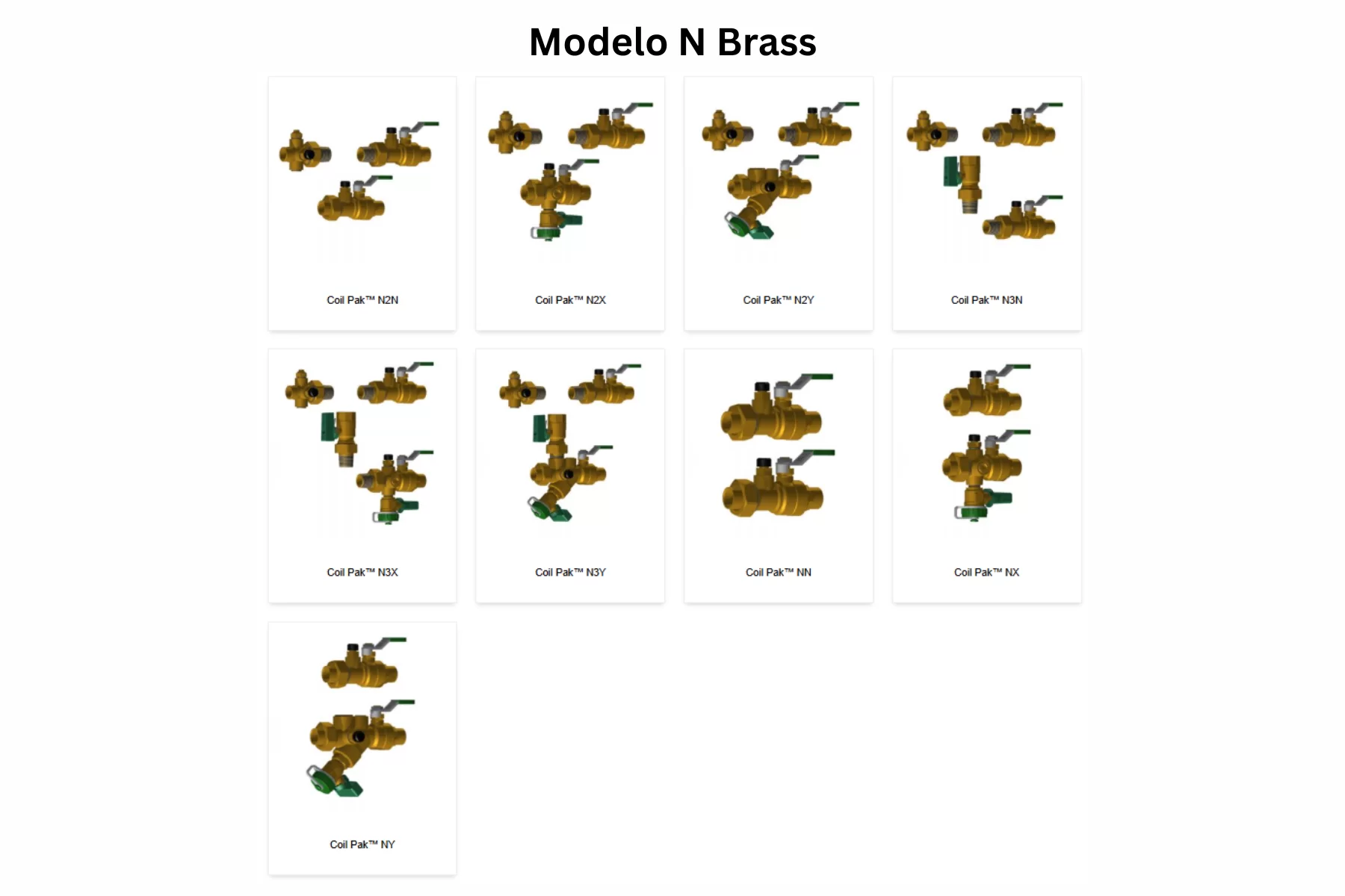 La familia Modelo N Brass agrupa los modelos N2N, N2X, N2Y, N3N, N3X, N3Y, NN, NX y NY. Se trata de Coil Paks con ball valve flow control, donde el retorno y el suministro integran combinaciones de UltraNXP™ NXP y uniones con puertos de prueba, además de manual air vent en el arreglo. La serie trabaja a 600 WOG y 325°F, con cuerpos y extremos en forged brass ASTM B283, bolas en latón cromado con opción inoxidable, sellos Teflon, sellos de flecha dual FKM o-ring y tamaños de ½” a 1½”. Las conexiones disponibles publicadas son Sweat, Female, NexPress o NexLok.