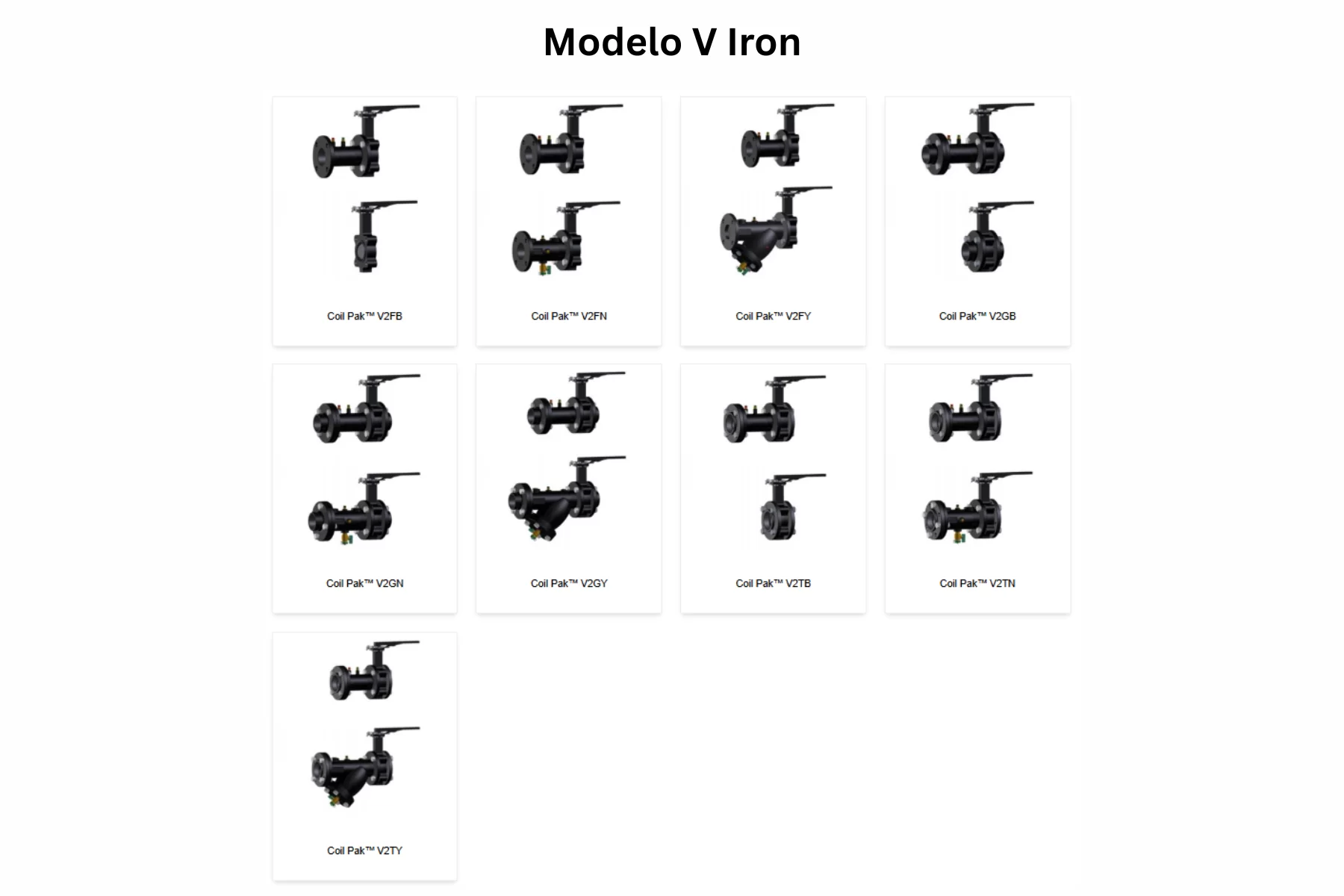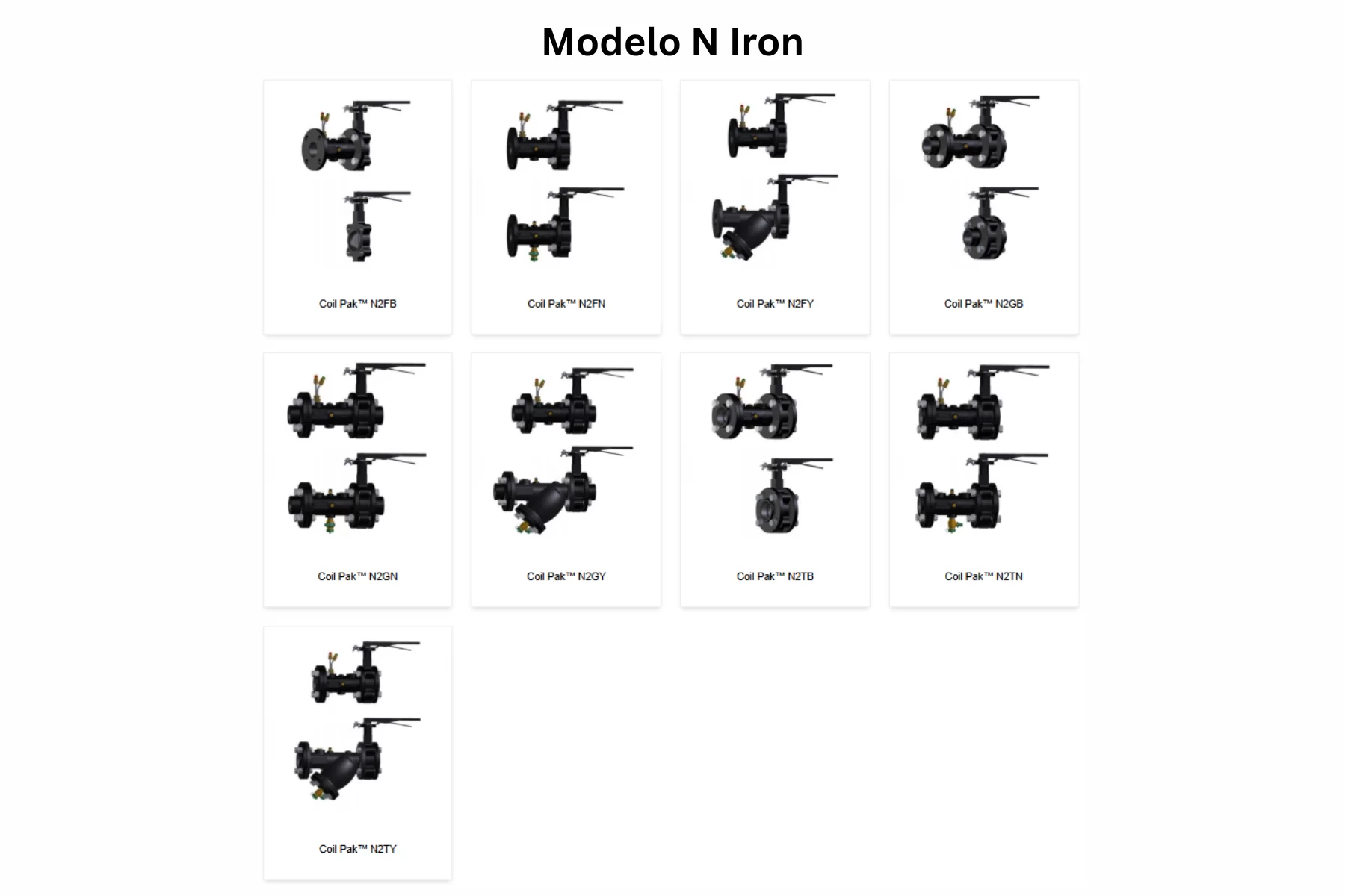 La familia Modelo N Iron reúne los modelos N2FB, N2FN, N2FY, N2GB, N2GN, N2GY, N2TB, N2TN y N2TY. Esta serie trabaja como paquete de manual balancing coil piping package con Nextrol™ y TwinTube™ Pitot en el lado de retorno. Las fichas revisadas publican 175 PSIG y 250°F, lug type butterfly valve with infinite position top plate, hanging tag y precisión de ±1%. En N2FY además se integra 125# flanged Y-strainer, removable filter screen y blowdown/drain valve. El rango de flujo publicado para esta familia va de 71.00 GPM a 4,611.00 GPM en tamaños de 2½” a 12”.