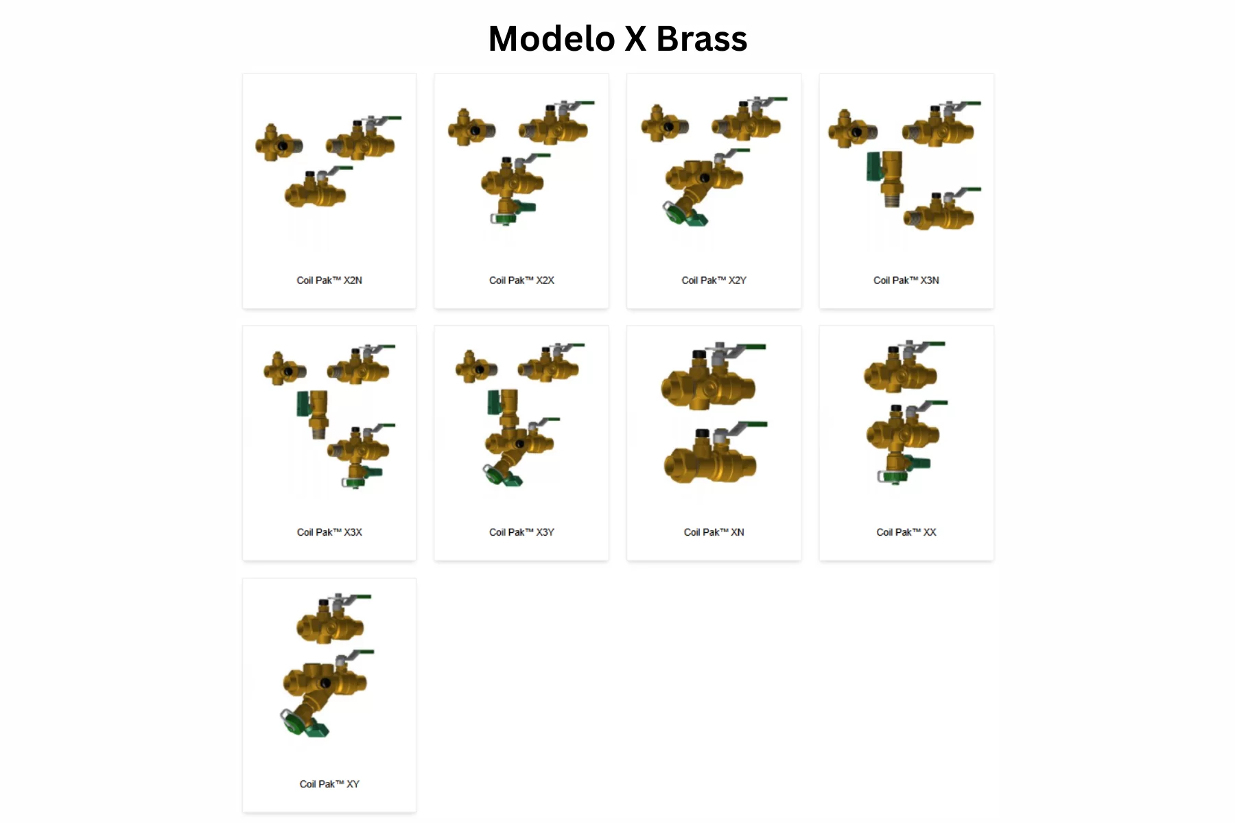 La familia Modelo X Brass reúne X2N, X2X, X2Y, X3N, X3X, X3Y, XN, XX y XY. Son Coil Paks con UltraX™ UX en el lado de retorno y combinaciones de válvula o strainer en el suministro según la configuración. En X2N, el retorno integra UltraX™ UX combination ball valve and union end con memoria de ajuste, más UltraU™ UU union con manual air vent, y el suministro utiliza UltraNXP™ NXP. En X2Y, el suministro cambia a UltraY™ UY combination strainer, ball valve and union end con blowdown/drain. La serie trabaja a 600 WOG y 325°F, con cuerpos en forged brass ASTM B283, bolas en latón cromado, sellos Teflon, sellos de flecha dual FKM o-ring y tamaños de ½” a 1½”.