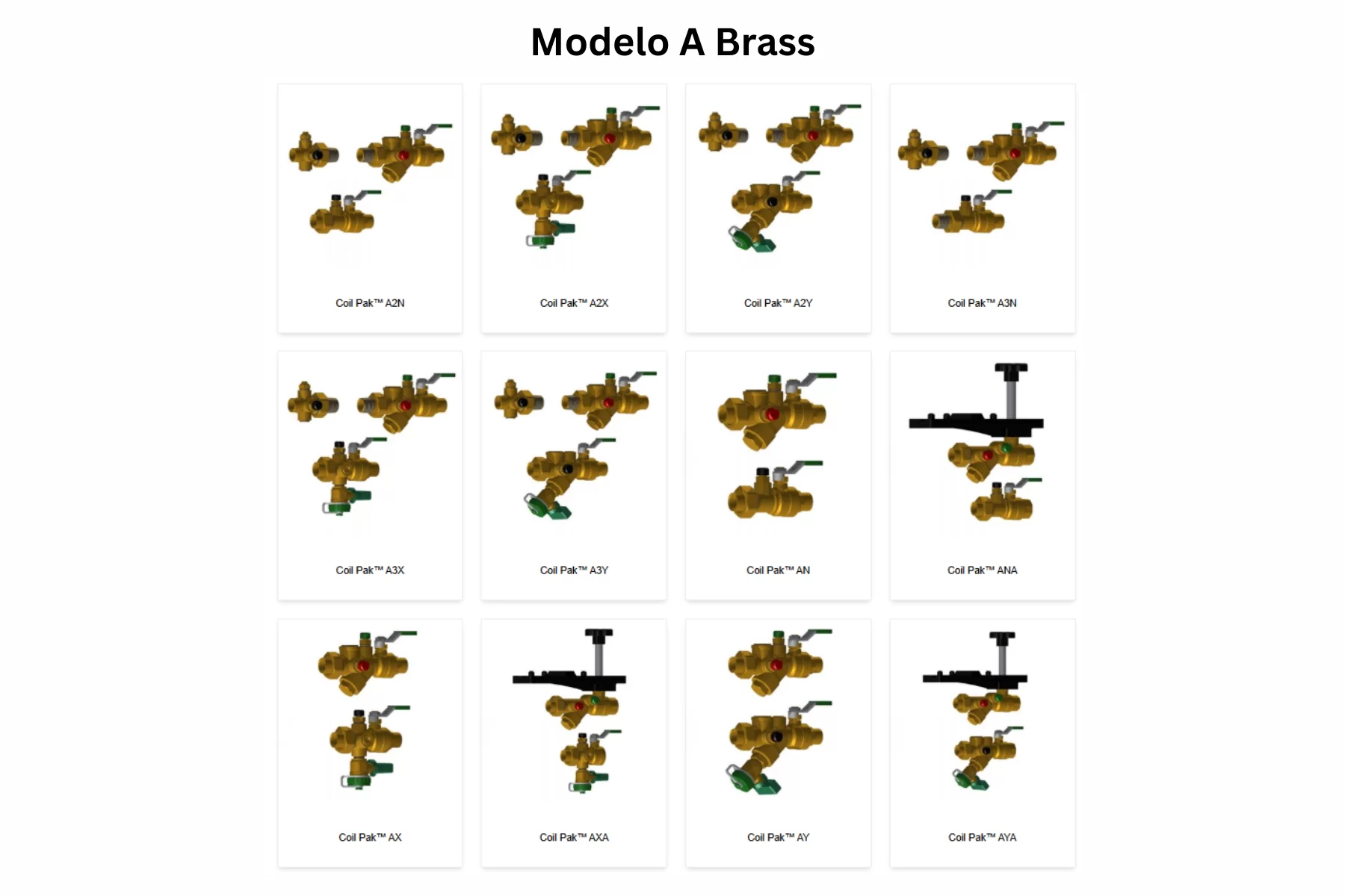 La familia Modelo A Brass corresponde a Coil Paks con automatic flow control valves y reúne los modelos A2N, A2X, A2Y, A3N, A3X, A3Y, AN, ANA, AX, AXA, AY y AYA. Esta serie trabaja a 600 WOG y 325°F, con extremos disponibles en FNPT, SWT, NexPress™ y NexLok™, extremos unión intercambiables, O-rings, flechas anti-expulsión, doble sello y removable, non-clogging flow cartridge, con precisión de ±5%. En función de la configuración, el rango de flujo publicado va desde 0.33 GPM hasta 100.00 GPM. En las configuraciones base como A2N se cubren tamaños compactos hasta 1½” STD, mientras que configuraciones como A2X y A2Y extienden la familia hacia 2” y 2½” con blowdown/drain cuando aplica.
