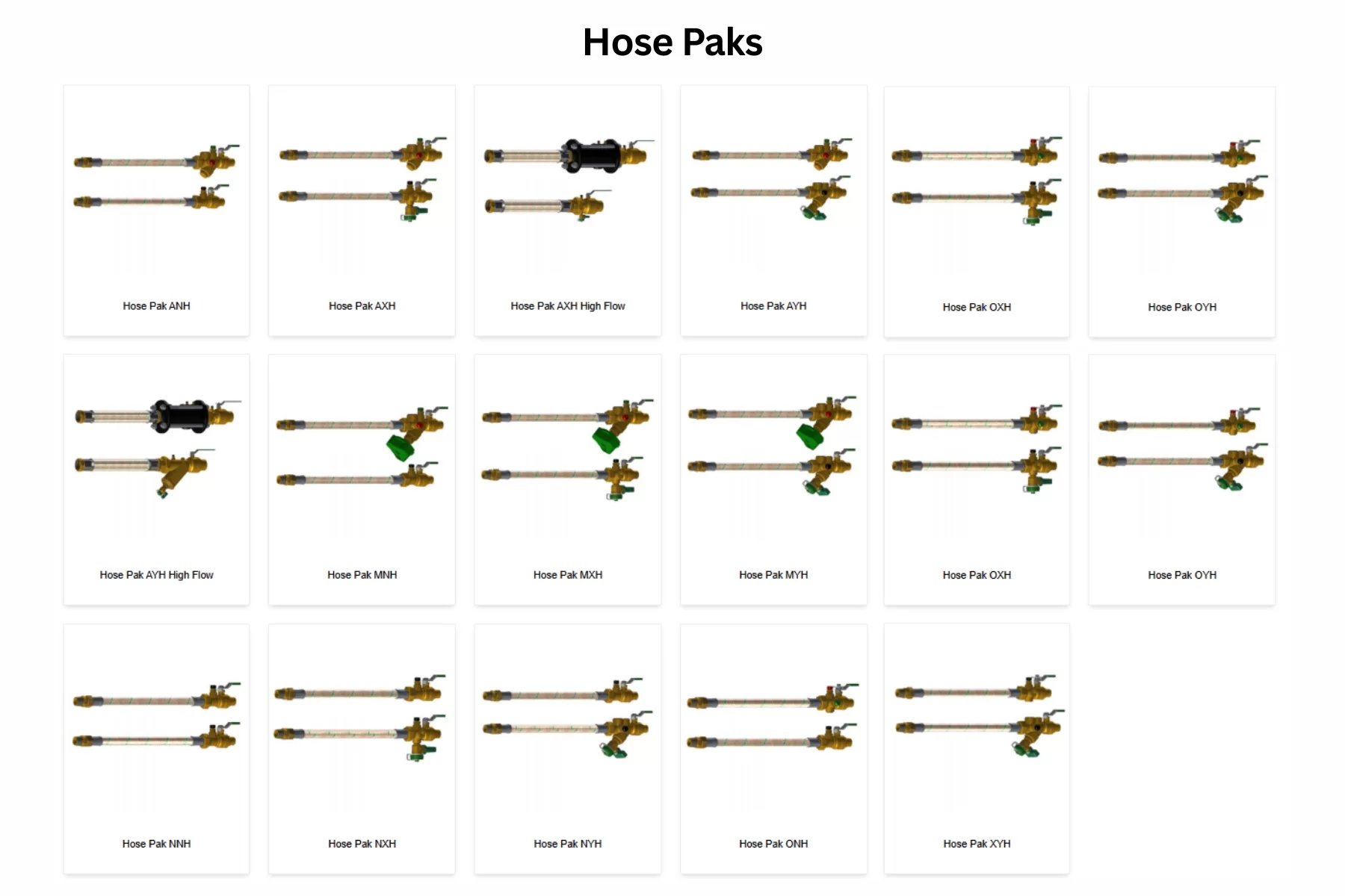 Manejamos Hose Paks, Unions & Isolation Valves y Flexible Hoses & Adapters. Dentro de esas familias se incluyen modelos como ANH, AYH, MNH, ONH, XNH, Configur-A-Ball CB, UltraC UC, UltraNXP NXP, UltraX UX, UltraT UTF, UltraT UTU, HLA, HNA, HSA, UFH, UFHF y UFHM.