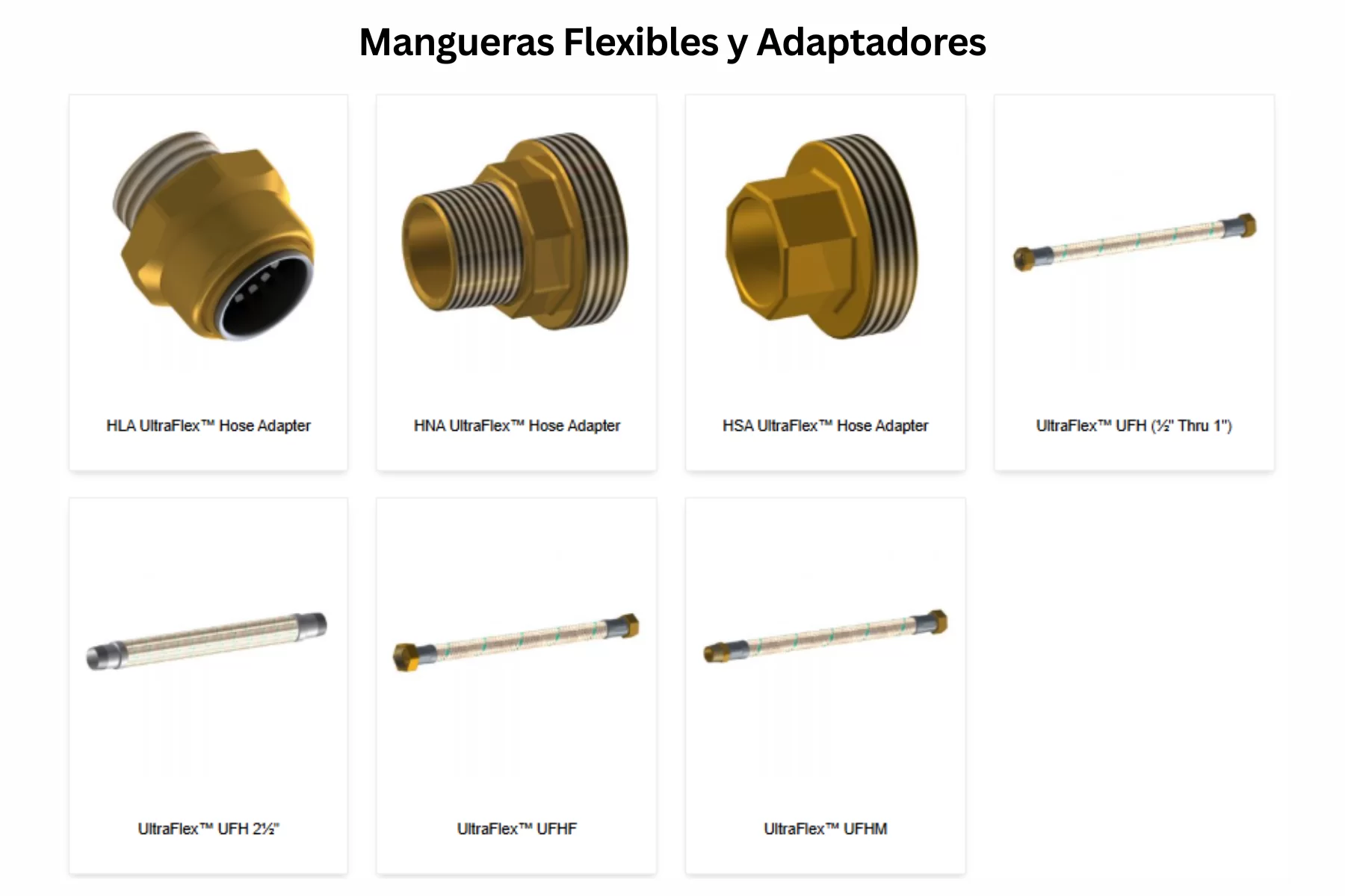 La línea Flexible Hoses & Adapters de Nexus permite resolver conexión flexible, absorción de tolerancias de instalación y transición entre la manguera y la conexión final al sistema o al equipo. Esta familia se compone de los adaptadores HLA, HNA y HSA y de las mangueras UltraFlex™ UFH (½” a 1”), UltraFlex™ UFH 2½”, UltraFlex™ UFHF y UltraFlex™ UFHM.