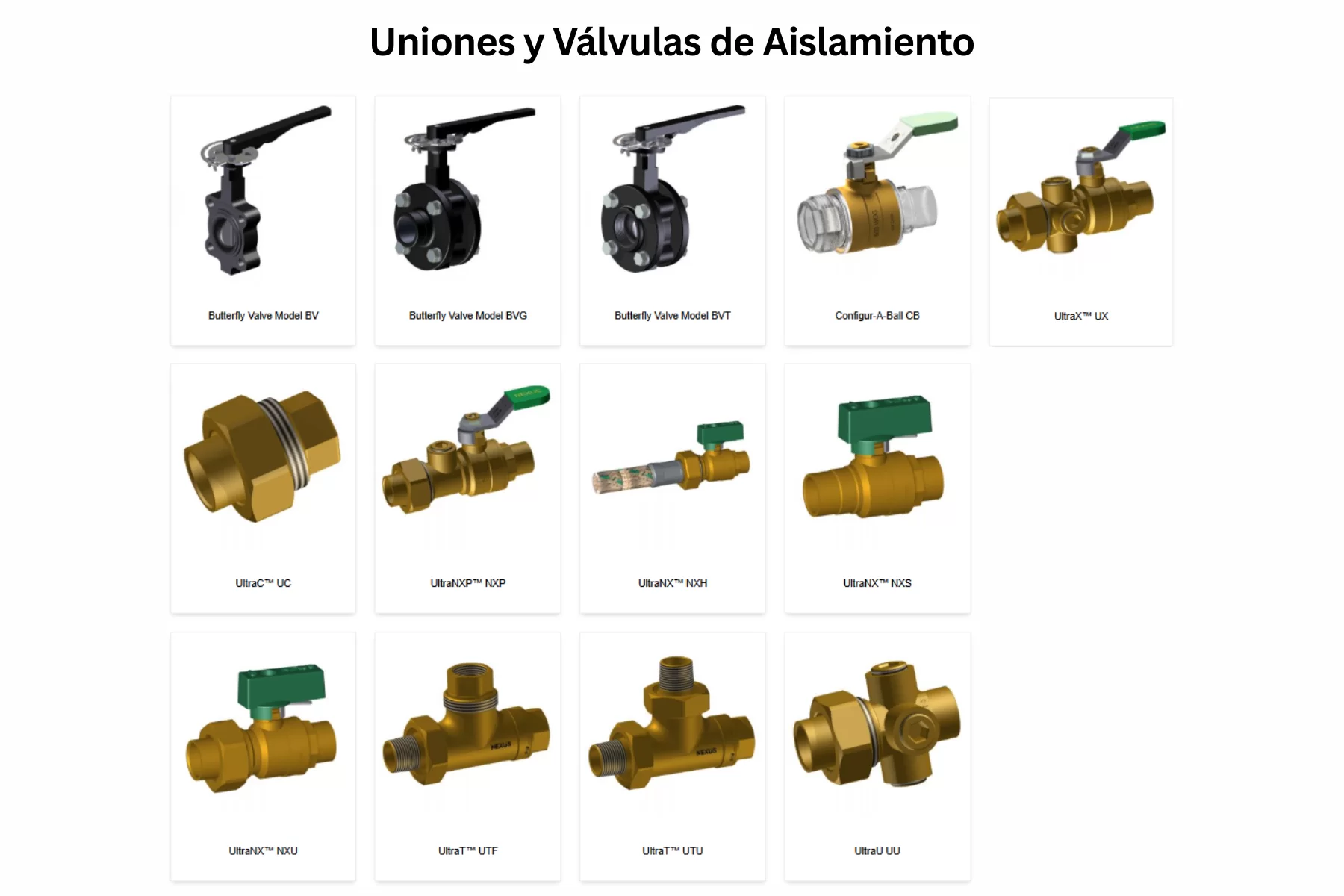 Dentro de esta categoría se concentran soluciones para estandarizar conexiones en serpentines, facilitar mantenimiento, absorber tolerancias de instalación y simplificar el armado del arreglo hidráulico. En Hose Paks, Nexus publica modelos como ANH, AXH, AXH High Flow, AYH, AYH High Flow, MNH, MXH, MYH, NNH, NXH, NYH, ONH, OXH, OYH, XNH, XXH y XYH. En Unions & Isolation Valves aparecen Configur-A-Ball CB, UltraC™ UC, UltraNXP™ NXP, UltraNX™ NXH, UltraNX™ NXS, UltraNX™ NXU, UltraT™ UTF, UltraT™ UTU, UltraU UU y UltraX™ UX, además de las válvulas mariposa BV, BVG y BVT. En Flexible Hoses & Adapters se integran HLA, HNA, HSA, UltraFlex™ UFH (½” a 1”), UltraFlex™ UFH 2½”, UltraFlex™ UFHF y UltraFlex™ UFHM.