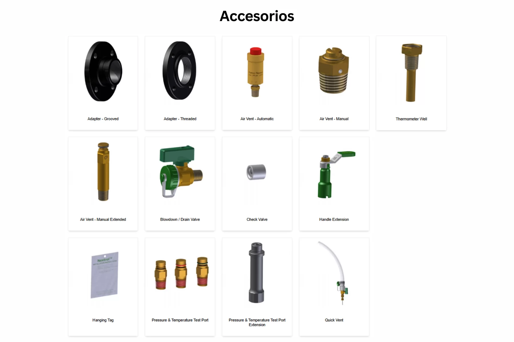 Incluye NexLok™ Connection System, HLA UltraFlex™ Hose Adapter, Adapter – Grooved, Adapter – Threaded, Air Vent – Automatic, Air Vent – Manual, Air Vent – Manual Extended, Blowdown / Drain Valve, Check Valve, Handle Extension, Hanging Tag, Pressure & Temperature Test Port, Pressure & Temperature Test Port Extension, Quick Vent y Thermometer Well.