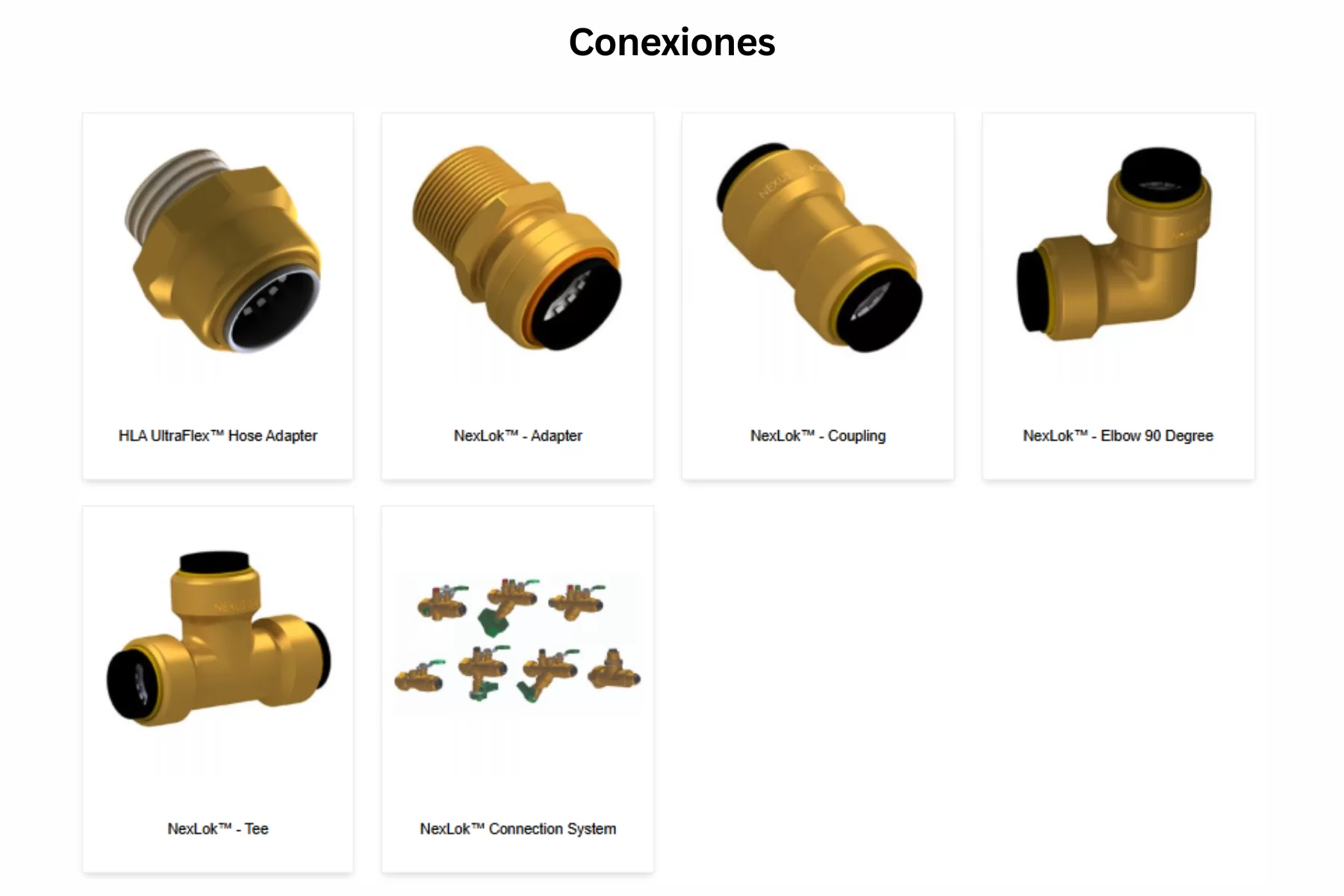 El bloque NexLok™ Connection System reúne la lógica general de la familia para integrarla en válvulas, Coil Paks y Hose Paks Nexus. Para ½” a 1” se publica con los modelos NexLok™ – Valves, Coil Paks, Hose Paks; para 1¼” a 2” se maneja dentro de la serie LD de la misma familia.