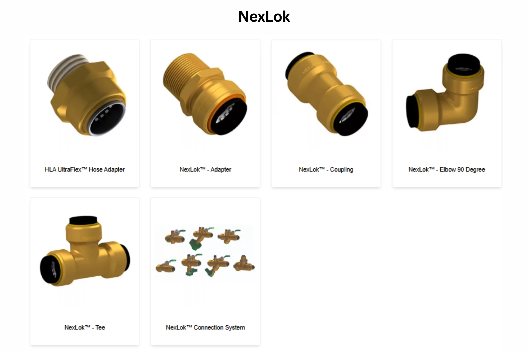 El HLA UltraFlex™ Hose Adapter conecta la línea de mangueras UltraFlex con el sistema NexLok™. Se publica como un adaptador con Male NPSH hose end y NexLok™ adapter end, con base de 250 PSI y 32°–200°F. Está fabricado con forged brass, EPDM, acetal resin, stainless steel y nylon 6/6, y se maneja en ½”, ¾” y 1”. Esta pieza es especialmente útil cuando el proyecto quiere combinar conexiones flexibles y transición rápida dentro del mismo ecosistema Nexus.