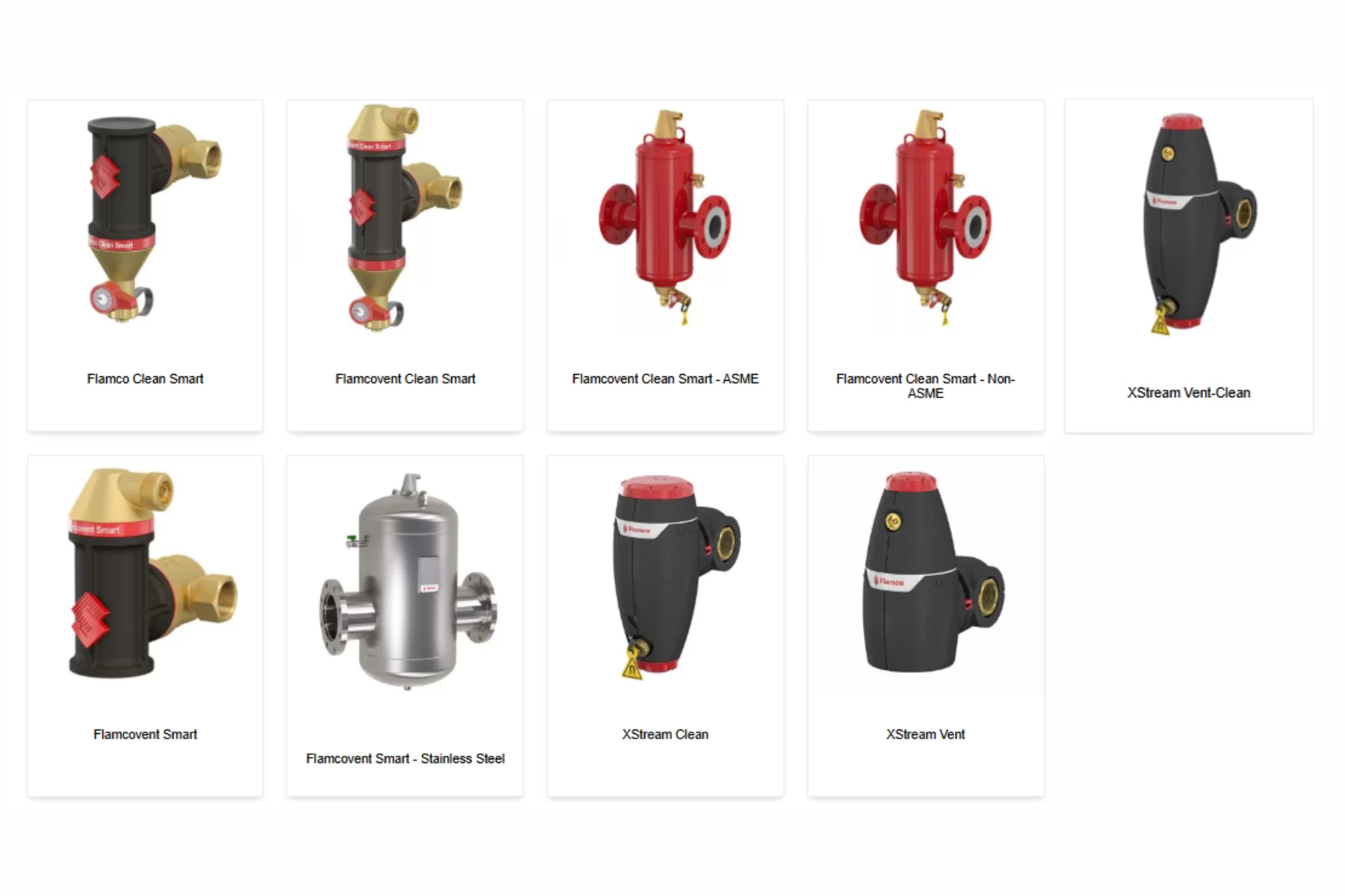 Esta familia puede organizarse en tres grandes grupos dentro de tu sitio para facilitar la navegación del cliente y mantener visibles las especificaciones de cada modelo: comerciales en acero al carbón, smart compactos y XStream de nueva generación. Flamco lista en esta categoría los modelos Flamcovent Clean Smart – ASME, Flamcovent Clean Smart – Non-ASME, Flamcovent Smart – Stainless Steel, Flamco Clean Smart, Flamcovent Clean Smart, Flamcovent Smart, XStream Clean, XStream Vent y XStream Vent-Clean.