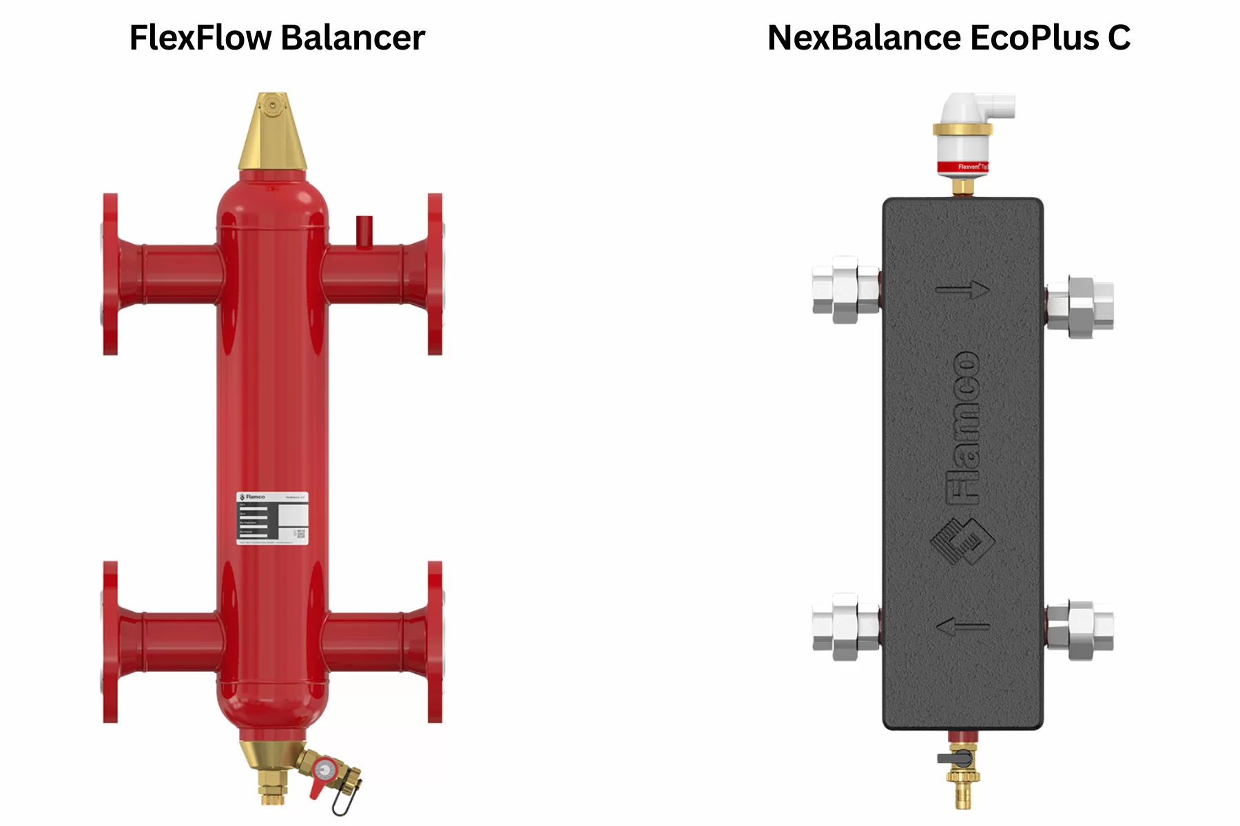 FlexFlow Balancer es una solución magnética ASME con remoción de aire, suciedad y partículas ferrosas, mientras que NexBalance EcoPlus C está orientado a simplificar el piping primario-secundario con separación integrada de aire y suciedad, cuatro conexiones y pozo para sensor de temperatura.