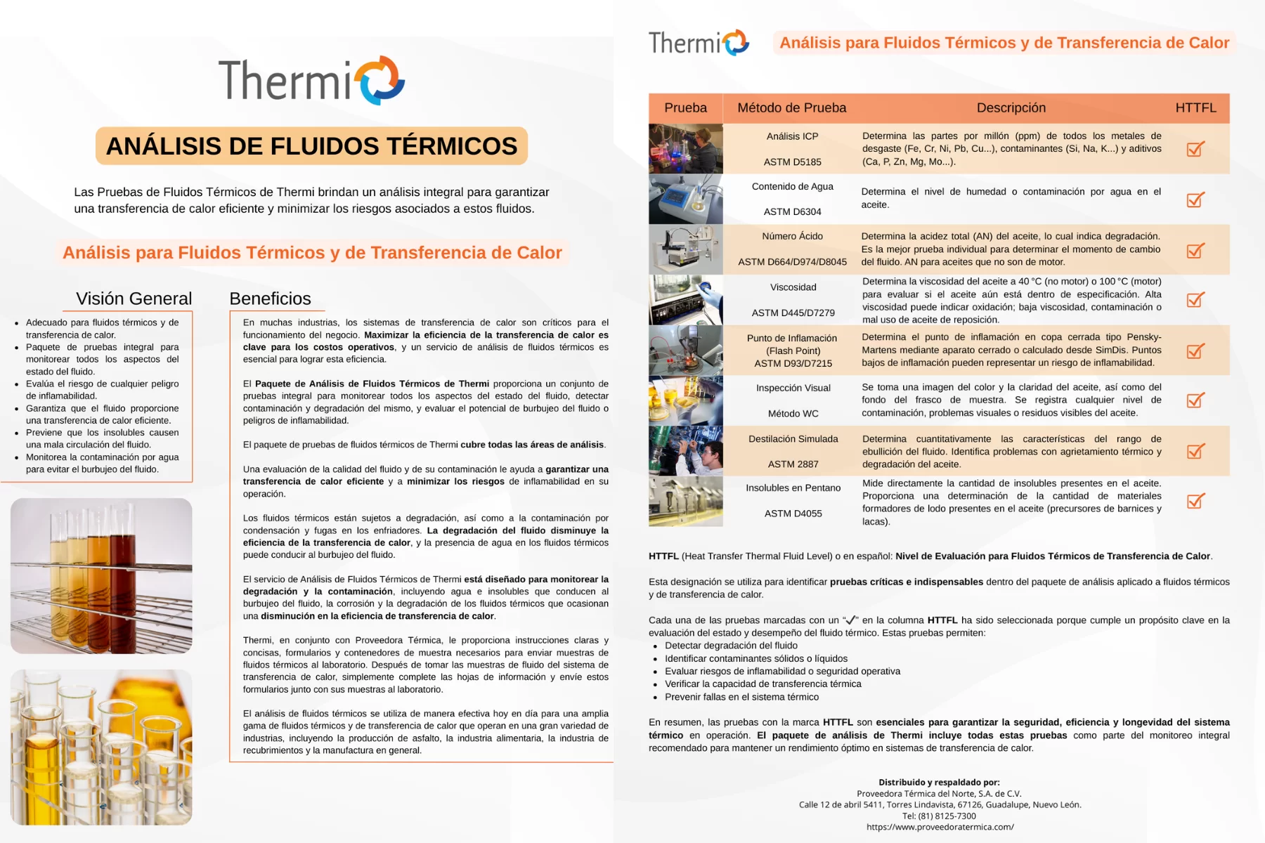 Este servicio permite conocer el estado real del fluido en operación, detectar degradación, contaminación por agua, presencia de insolubles, cambios de viscosidad y posibles riesgos de inflamabilidad. De acuerdo con la información técnica de Thermi, el paquete de análisis está diseñado para monitorear todos los aspectos del estado del fluido y ayudar a mantener una transferencia de calor eficiente y segura.